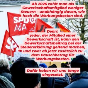Die SPD Arbeitsgemeinschaft für Arbeit (AfA) begrüßt einen wichtigen Fortschritt für die Gewerkschaften in Deutschland: Ab 2026 können Mitglieder ihre Gewerkschaftsbeiträge bei der Steuer geltend machen. Dieses Signal stärkt die gewerkschaftliche Basis und unterstreicht die Bedeutung von solidarischem Engagement für bessere Arbeitsbedingungen.
